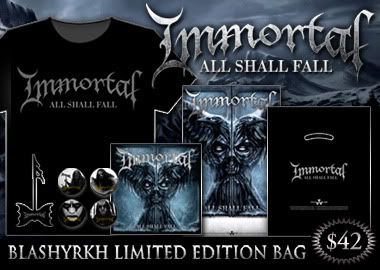 The Blashyrkh Limited Edition Bag edition includes: Digipak version of All Shall Fall, Logo T-Shirt (Size of your choice), Abbath's replica battle axe in the form of a stainless steel pendant, 4 buttons, double-sided poster, and the special black Immortal plastic bag!